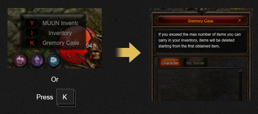 [edit]As recompensas são enviadas automaticamente para o Gremory Case. O Gremory Case pode ser acessado pressionando a tecla K dentro do jogo.