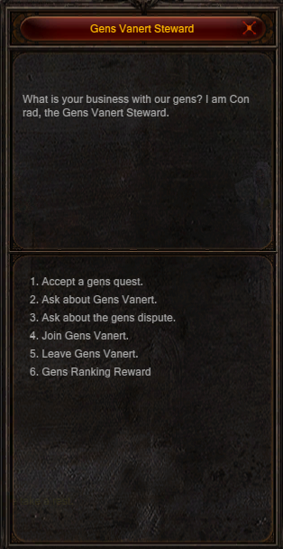 Além do alistamento, o NPC da Gens Vanert permite ao jogador visualizar sua classificação atual, monitorar o progresso na competição e resgatar recompensas de acordo com sua contribuição à facção.