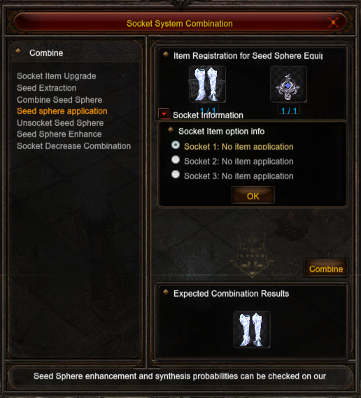 Itens com sockets: Apenas equipamentos específicos, como armas, armaduras e escudos de nível 380 ou superior, podem ter slots de socket. O número de slots varia de 1 a 3, e cada slot vazio é um espaço onde o jogador pode inserir uma Seed Sphere para adicionar poderosas opções.