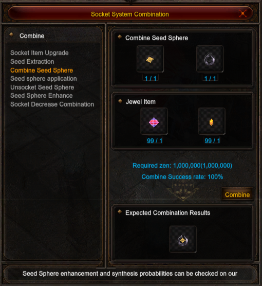 Quando um jogador insere três Seed Spheres em um item socket (arma, armadura ou escudo), há uma chance de ativar um bônus socket especial, dependendo da combinação e ordem das sementes inseridas. Esse bônus pode fornecer vantagens adicionais que não são possíveis apenas com os efeitos individuais das Seeds.