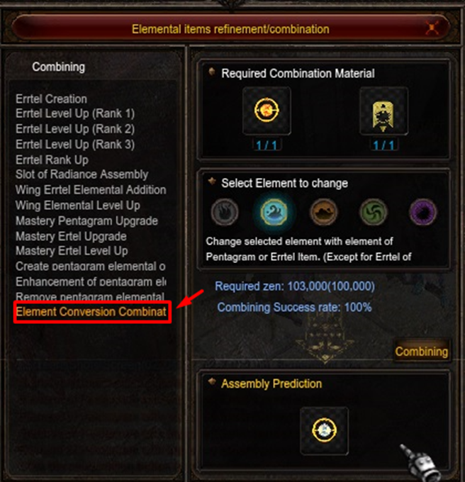 Clicando no NPC Adniel, irá aparecer a função Element Conversion Combination. Para combinar serão pedidos o Ertel + Talisman Element Change, selecione o elemento do qual você deseja converter e a combinação funcionará 100%.